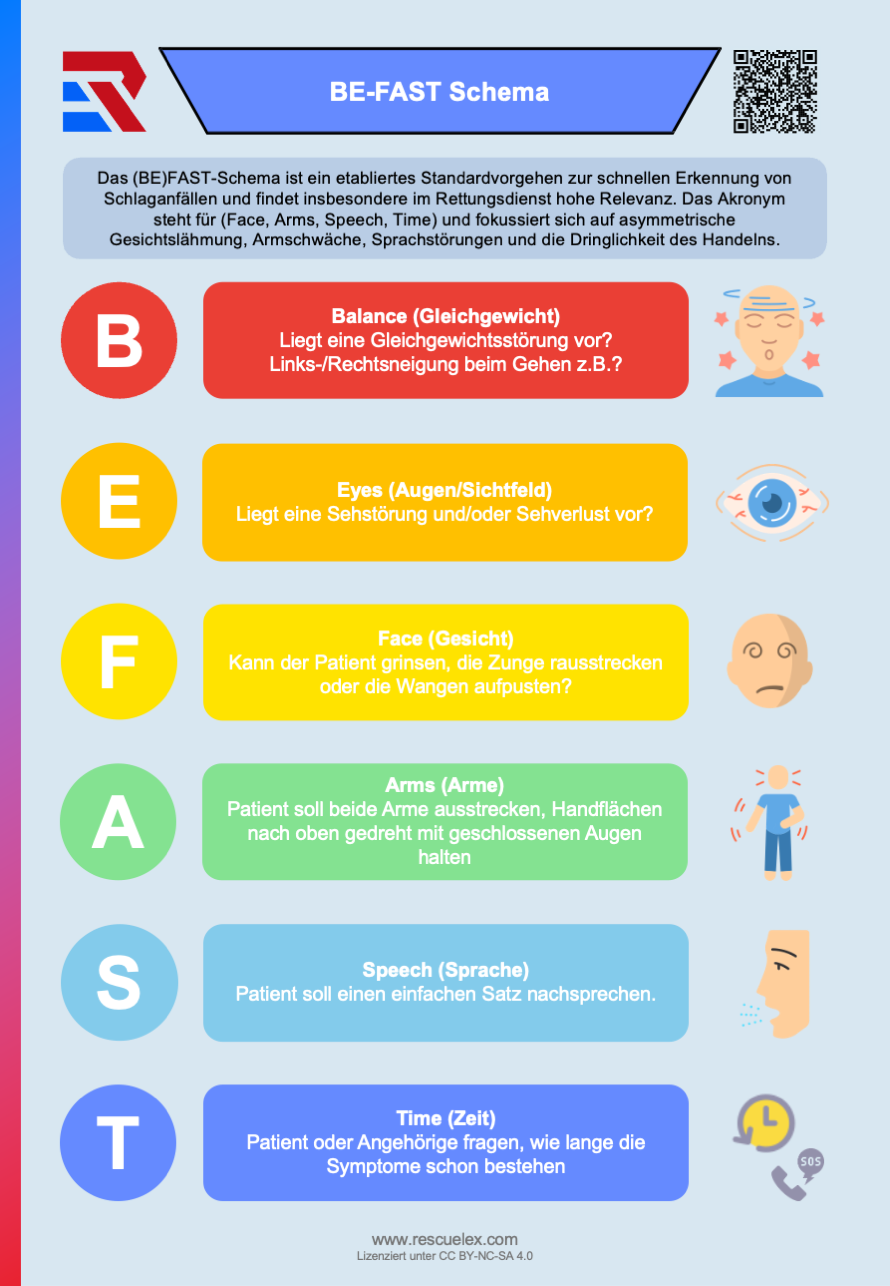 - Time (Zeit): Patient oder Angehörige fragen, wie lange die Symptome schon bestehen und ob sie in den letzten Stunden bereits öfter aufgetreten sind. Time is Brain (Minderversorgung führt nach max 6h zu irreversiblen Hirnschäden).