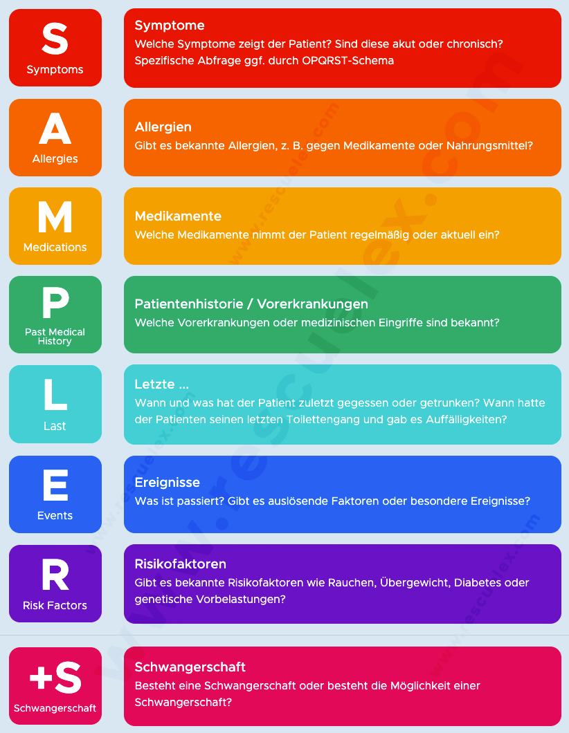 Von Symptomen und Allergien bis hin zu Risikofaktoren und besonderen Ereignissen deckt das SAMPLER-Schema alle relevanten Aspekte ab. Egal ob in der Notaufnahme, im Rettungswagen oder bei der Erstversorgung – mit SAMPLER behältst Du stets den Überblick und sicherst eine hohe Versorgungsqualität.